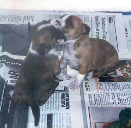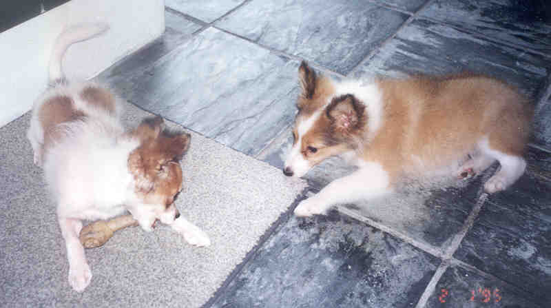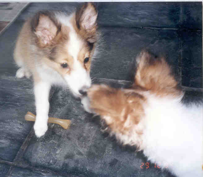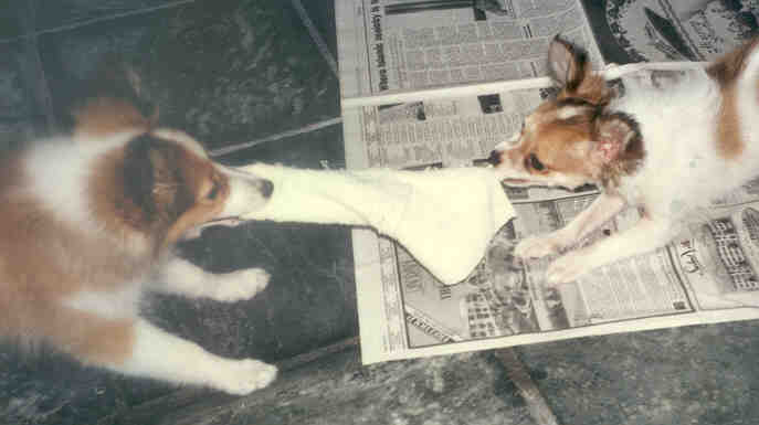 Puppies Furby and Holly squabbling over a rawhide bone. |